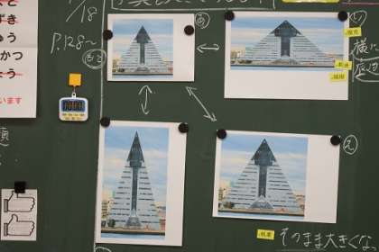 算数「図形の拡大と縮小」の学習に取り組んでいます。拡大した図形や縮小した図形は、それぞれ縦・横の長さがどのように変わったのか考えました。