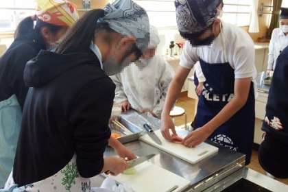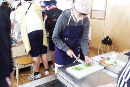 家庭科で「彩り野菜炒め」を作りました。ニンジンやピーマン、ハムなどを包丁できっていきます。ぜひ、家庭でもトライしてみてください。