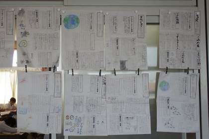 4年生の教室の外側に、子どもたちがつくった新聞が掲示されています。これは、ゴミに関してそれぞれ自分が調べたテーマにそって作成したものです。「なるほど」とうなるものもたくさん。