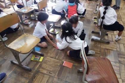英語でカラー(色)の学習に取り組みました。みんなで楽しく学習できるように、ゲーム形式でチャレンジです。子どもたちの歓声が響いていました。