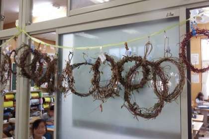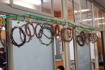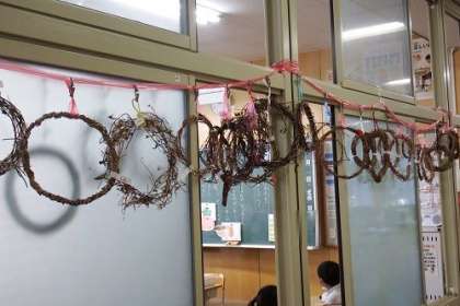 1年生が作成する予定のリースの土台を、廊下側に掲示しています。いつか1年生の子どもたちが、このリースに素敵な飾りつけをしてくれるだろうなと想像しています。