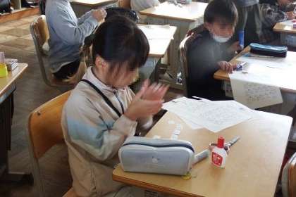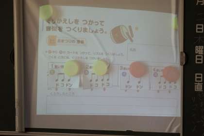 「くりかえしをつかって、音楽をつくりましょう」に取り組みました。自分で手を打ちながら、曲を作り上げていきます。楽しいリズム、楽しい音楽をたくさん作ることができました。
