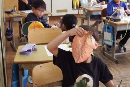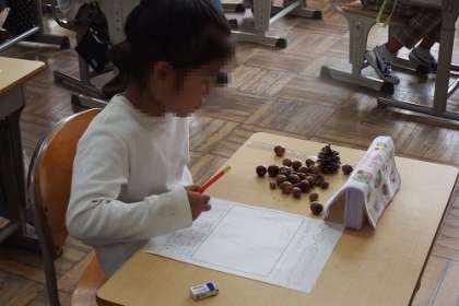 先日、深田公園でたくさんの秋を見つけてきた子どもたち。その様子に記録にまとめました。自分が見つけてきた葉っぱやどんぐりを目の前に、絵を描いたり、文章を綴ったり。