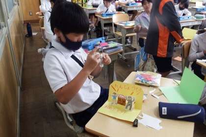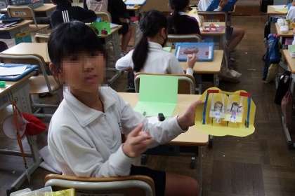図工でハッピーカードを作りました。誰にどんな幸せを届けようか、各自で考えました。カードからとびだす仕掛けが、とても面白かったです。もらった人は、きっと幸せになれるはず。