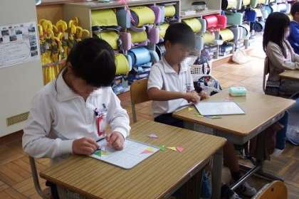 算数「かたちづくり」の学習で、色板を並べていろいろな形を作りました。子どもたちは、机の上に出した瞬間から形をつくりたくてうずうず。いろいろな形を考え出しました。