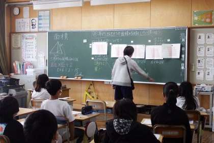 算数「面積」で、平行四辺形の面積を求める方法について学習しました。子どもたちからたくさんの方法が出されましたが、これが面積の公式につながっていきます。