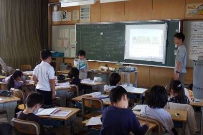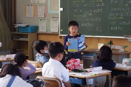 これまで学習してきた、かけ算を使って、問題を作りました。なしやみかん、じゃがいも、にんじんなどの絵をもとに考えます。友だちが作った問題を解いてみました。