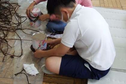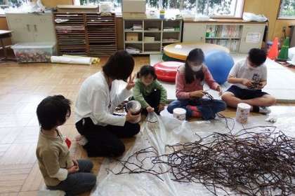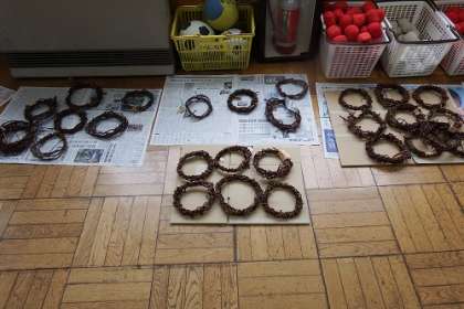 リース作りが始まっています。乾いて固くなったリースを水につけて柔らかくし、水気をふき取った後、手早くリースの形を作らなくてはなりません。完成まで、協力しながら頑張ります。
