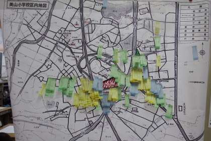 生活科で作った学区の地図です。子どもたちが考えた各地区のおすすめポイントがまとめらえています。この後の見学で、それを確認してきます。