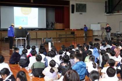 あいづままもる隊の皆さんによるドローンを使った見守り活動が始まります。今日のそのはじめとして、1・2年生を対象にドローンの紹介をしていただきました。クイズあり、デモンストレーションあり、あいづままもる君の登場し、大いに盛り上がりました。この日は、雨のため、ドローンによる見守りは中止となりましたが、今後が楽しみです。