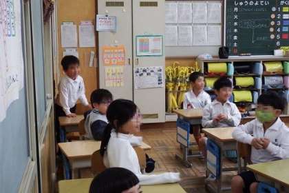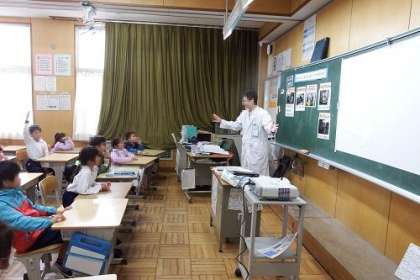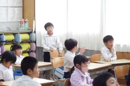 栄養士の先生をお招きし、1年生の食育学習を実施しました。この日は、給食が運ばれてくるまでの学習を行いました。大きな道具を使って、みんなの給食をつくることにびっくり。たくさんの人の手によって、給食が作られていることも学びました。