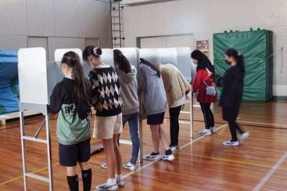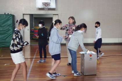 6年生の出前選挙講座を実施しました。選挙権が18歳に引き下げられ、あと6年すると投票に参加することができます。選挙の意味と方法を理解してもらうために、講座を開きました。講座の後半は、模擬投票を行いました。