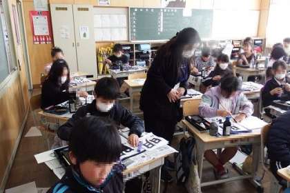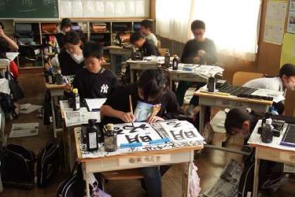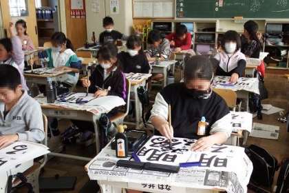 いよいよ書初め練習に入りました。今年の4年生の文字は「明るい声」です。この日は、文字の中心や漢字とひろがなの字の大きさに気をつけて書くことを学習しました。