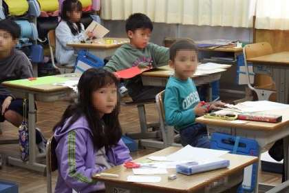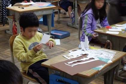 図工「おってたてたら」の学習に入りました。この日は、特にはさみの使い方を学びました。真っすぐに切ったり、曲線にきったり、ジグザグにきったり。練習を繰り返しながら慣れていきます。