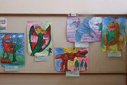 4年生が使う踊り場に、読書感想画「ぼくがきょうりゅうになったとき」を掲示しました。今にも画面から恐竜が飛び出してきそうです。迫力が伝わってきます。