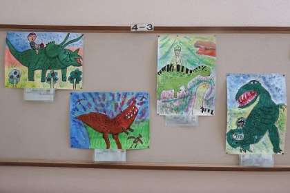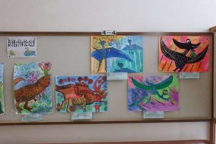 4年生が使う踊り場に、読書感想画「ぼくがきょうりゅうにだったとき」を掲示しました。今にも画面から恐竜が飛び出してきそうです。迫力が伝わってきます。
