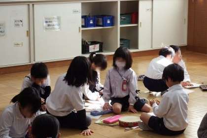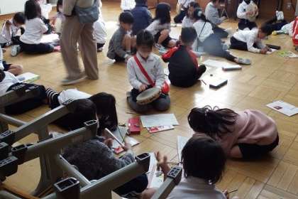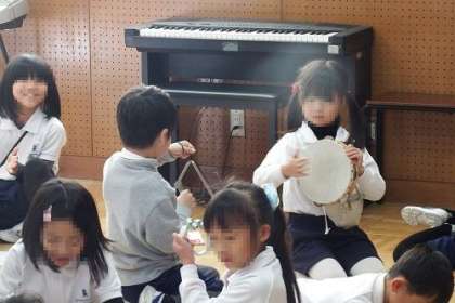 音楽の授業で、いろいろな楽器の音を見つけました。トライアングル、すず、タンブリン カスタネット・・・高い音や乾いた音、軽い音、いろんな音が教室に響きました。