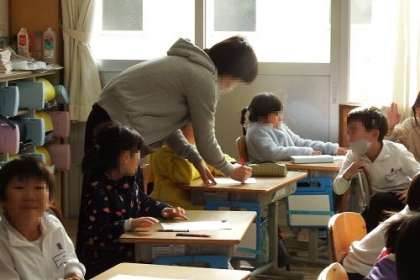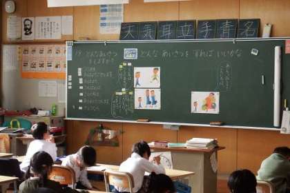 資料「どんなあいさつをしますか」を使って、道徳の学習を行いました。資料は、3枚の絵です。クラスの友達と会った時、お姉さんとお姉さんの友達に会った時、お隣のおばさんに会った時、それぞれどんなあいさつをすればよいのか考えます。