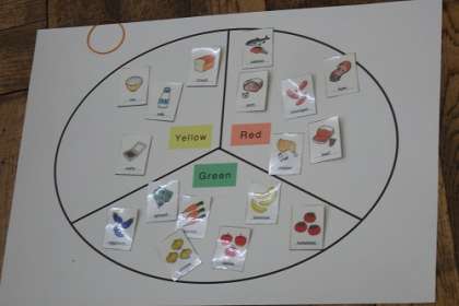 英語で、食n材を3つの栄養素のグループに分ける学習に取り組みました。赤=red、緑=green、黄=yellow。上手く3つの分けられたでしょうか。