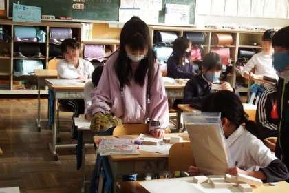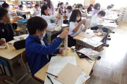図工「くぎうち トントン」の制作に取り掛かっています。自分の考えた形通りにつくれるのか、材料は足りるのか、足りなければどのように変えればいいのか、構想を練り直します。