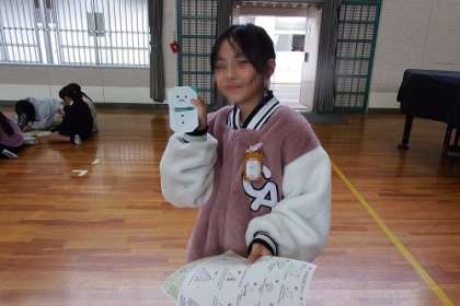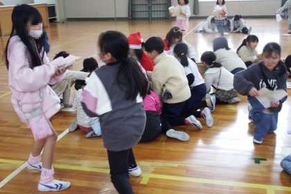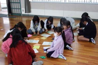 イベントママさんが行っている折り紙企画。この日は、2、4、6年生、7・8・9・10組を対象として日でした。前回同様、たくさんの子どもたちが体育館に集まりました。作り方のプリントを手に、「家でつくってみよう」という子も。