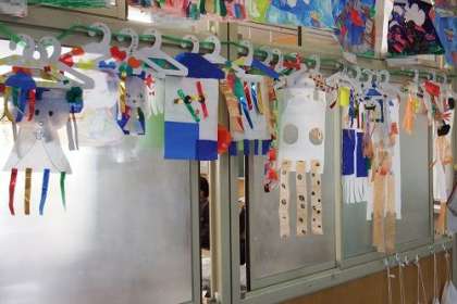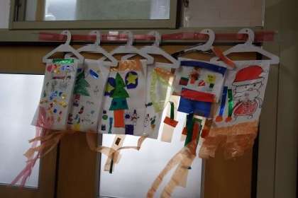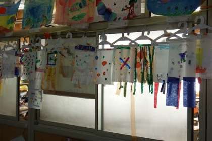 図工「ゆらゆらゆれて オリジナルハンガーを作ろう」の作品が完成しました。廊下側の飾られているハンガーが、風に吹かれてゆらゆらゆれています。