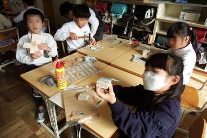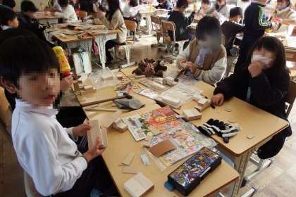 図工「くぎうち トントン」の制作中!慣れない金槌をしっかりと握りしめ、くぎをトントン打ち付けていきます。自分のイメージに近づけようと、材料を組み合わせていきます。