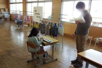 ピアニカのテスト中。子どもたちはみんな真剣に楽器に向かっています。テストが終わると、ふ〜と緊張が解けていきます。