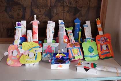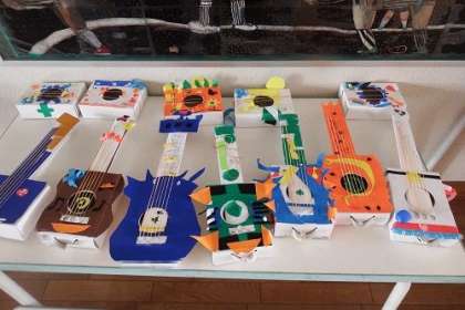 図工で取り組んでいる「音づくりフレンズ」の作品が完成しつつあります。渡りに展示されている作品は色とりどり。素敵な音色を響かせてくれそうです。