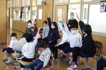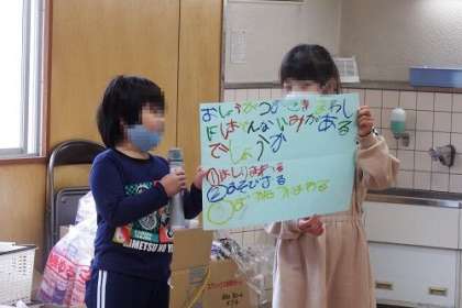 冬パーティーで、お正月にまつわるクイズを出題しました。例えば「お正月のこま回しにはどんな意味があるでしょう」みんな楽しくクイズに挑戦することができました。
