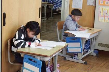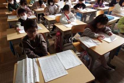1・2時間目に行った書初め大会では、子どもたちが黙々と真剣に取り組んでいました。年の初めに、思いを込めた書初めが書けたようです。写真は、1年生の書初め大会の様子です。
