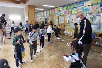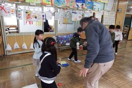 老人クラブやボランティアの皆様に講師としてお越しいただき、1年生が昔あそびの会を実施しました。日本に伝わる昔あそびの方法やコツを、たくさん教えていただくことができました。子どもたちは、何度も挑戦しながらコツをつかんでいったようです。会の後、子どもたちから「楽しかった」という声が、たくさん聞かれました。写真は、お手玉とけん玉の様子です。