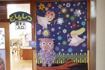 図書館整備ボランティアの皆さんが、新しいタペストリーを作成していただきました。現在、図書館の入り口に飾られています。素敵なタペストリー。子どもたちも、楽しみながら図書館に行けそうです。ありがとうございます。