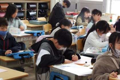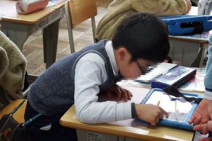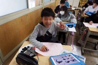 図工で「スチレン版画」に取り組みます。海の世界を想像して描きます。たこやお魚、クジラなどを描きながら、下書きを考えました。