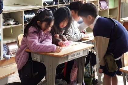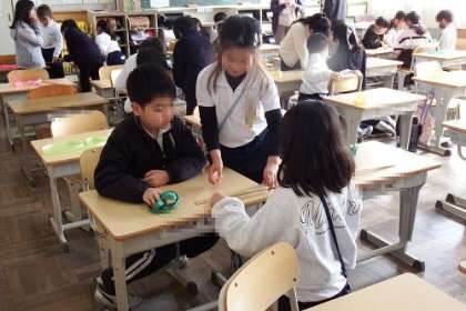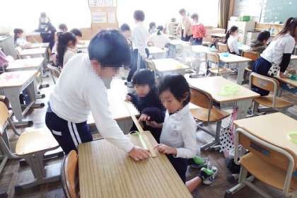 「黒板の横の長さは、どれくらいかな」算数の学習で、100センチメートルをこえる長さをはかる学習に入りました。1メートルものさしや1メートルのテープを使って考えていきます。