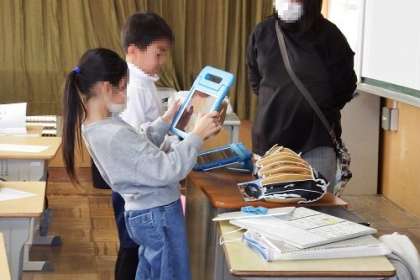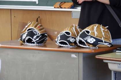 大谷翔平選手から贈っていただいたグローブが、子どもたちのもとへ。各教室を回っています。この日は、2年生でした。グローブをはめてみたり、写真をとってみたり。みんなグローブの感触を確かめているようでした。