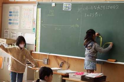 100センチは、1メートルです。これを使って、教室や廊下のいろいろなものの長さを調べました。図ってみると意外に長かったり逆に短かったりすることが分かりました。