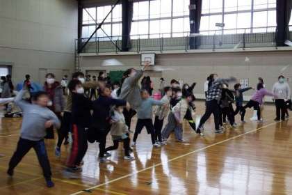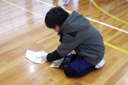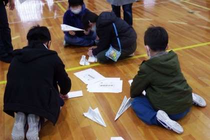 イベントママさんによる企画「紙飛行機をとばそう!」呼びかけの放送と同時に、多くの子どもたちが体育館へ。自分で作った紙飛行機を手に、何度も何度も飛ばしていました。