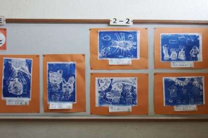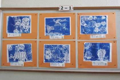 2年生の版画作品「たのしく うつして」を、学年掲示板に掲示しています。版画のあたたかさを感じる作品がたくさん。足をとめて眺めている子もたくさんいます。