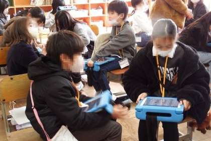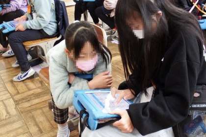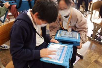 今日の課題は、「学校のお気に入りの場所クイズをしよう」です。Where is your fovorite place?の疑問文を使い、タブレットでお気に入りの場所をさがします。