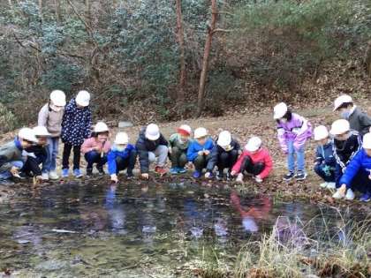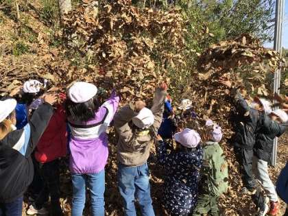1・2年生がトヨタの森の体験学習を行っています。自然豊かなトヨタの森で、木や草を観察したり、森や池にいる生き物を見つけたり、枯れ葉を使って遊んだり。学校では味わうことができない素敵な体験を行っています。