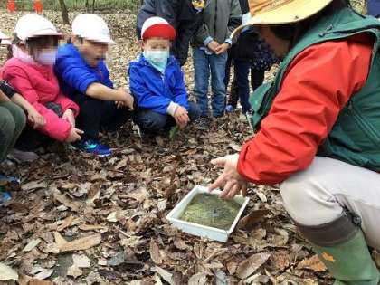 1・2年生がトヨタの森の体験学習を行っています。自然豊かなトヨタの森で、木や草を観察したり、森や池にいる生き物を見つけたり、枯れ葉を使って遊んだり。学校では味わうことができない素敵な体験を行っています。
