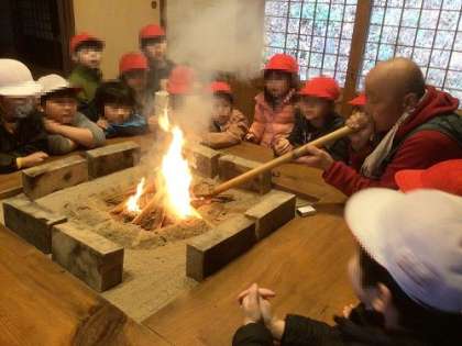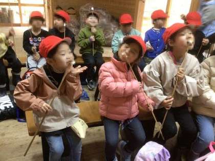 1年生のトヨタの森体験が続いています。鳥のさえずりを聞いたり、池に住む生物を観察したり・・・。森の中で、自然に触れ合うだけでなく、囲炉裏の体験なども行うことができました。