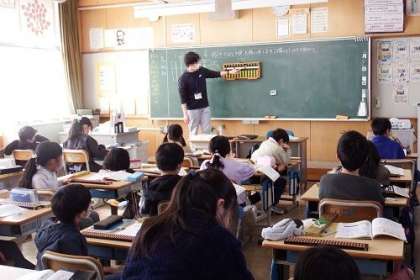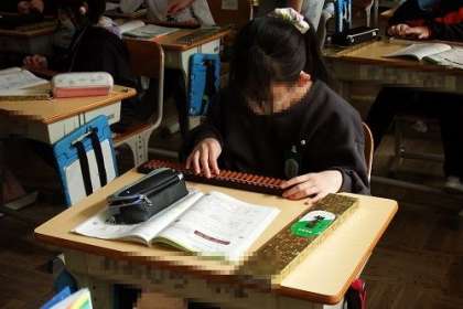 初めてのそろばん学習。まずは、数の表し方です。一の位、十の位、千の位・・・と読み方や数の入れ方を学習しました。続いて、たし算やひき算です。