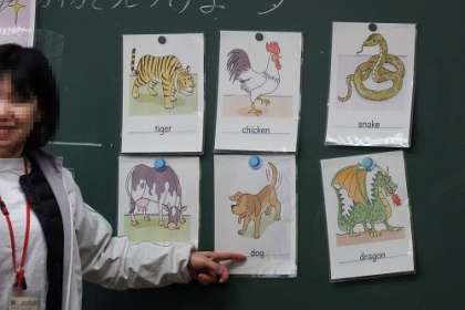 「あなたは、 どんな動物が好きですか?」「What do you like?」とりににわとり、へび、牛・・・。子どもたちに一番人気があった動物は?。