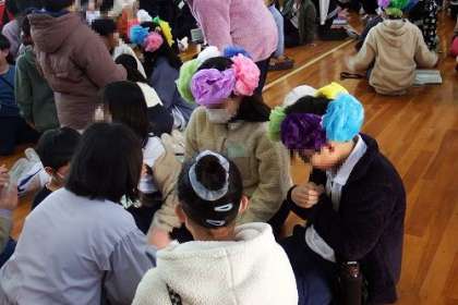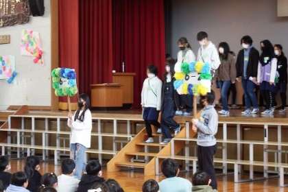 各学年の送る会が終わった後に、5年生の司会・運営のもと全校で送る会を行いました。お世話になった6年生へ花冠を作り、みんなで作ったプレゼントを贈りました。クイズをしたり、後期の引継ぎをしたり、エールを送ったり・・・。久しぶりに全校で歌う合唱は圧巻でした。とても素敵な送る会になりました。