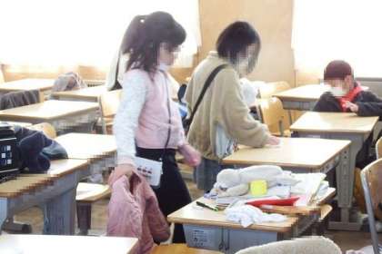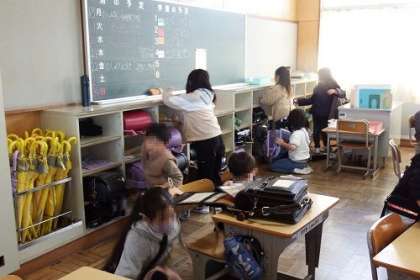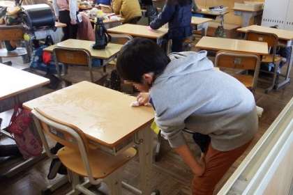 修了式まであと3日。1年間過ごした教室の中を念入りに掃除。自分の机やロッカーなど、次の学年の子どもたちが気持ちよく使えるように、一生懸命にきれいにしました。写真は、2年生の様子です。