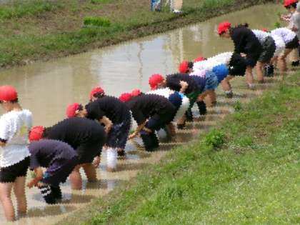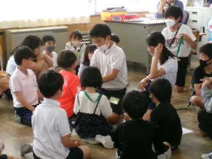 5年生が田植えをしました。JAの方にご指導いただき、泥だらけになりながらも頑張って植えました。今年度、初めてのなかよし集会を行いました。手作りのメダルに1年生は大喜びでした。
