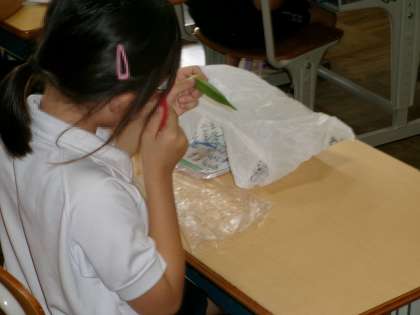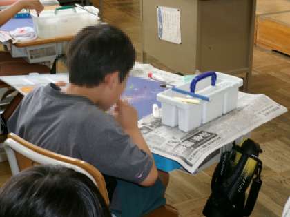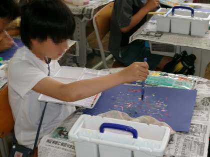 育てている野菜を観察する3年生。細かいところまで虫眼鏡で見ています。図工では、絵の具に息を拭きかけたり、筆の使い方を工夫したりすることで、絵の具に動きが出て、素敵な花火が出来上がりました。