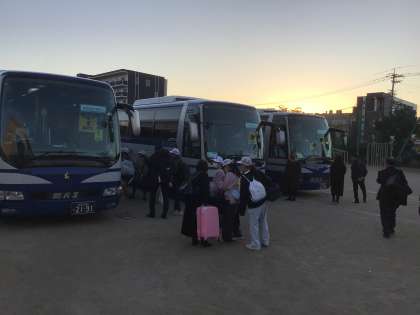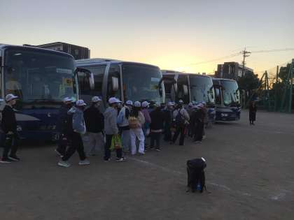クラスごとにバスに乗り込みました。高速道路で奈良に向かいます。
